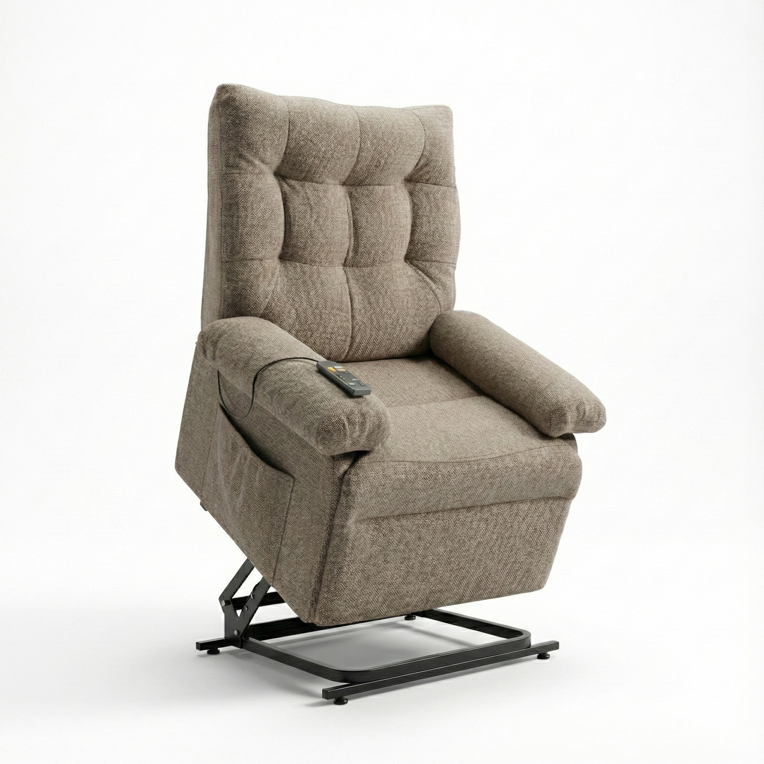 The NeoRise Powerlift Recliner delivers premium comfort and functionality for discerning users who value both relaxation and practicality. Three synchronized motors provide independent control of the backrest, footrest, and seat elevation, enabling personalized positioning with precision. Crafted from breathable fabric, this recliner maintains optimal comfort during extended sitting sessions while promoting air circulation. Designed with seniors in mind, the NeoRise incorporates intuitive remote-held controls for effortless operation. A strategically positioned side pocket keeps essentials—reading glasses, remote controls, or personal items—within arm's reach, eliminating the need to leave your seat. Experience the perfect balance of therapeutic support and everyday convenience.